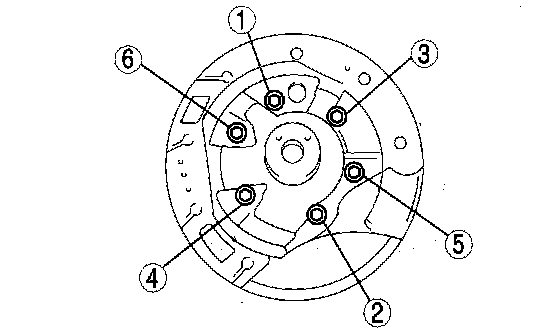 ^ Loosen the mounting bolts evenly in the pattern shown and remove the oil pump cover from the oil pump housing.