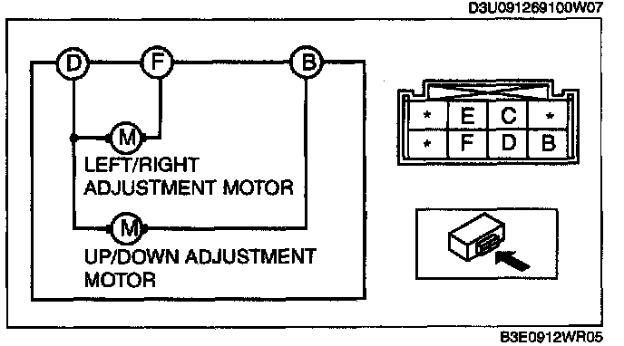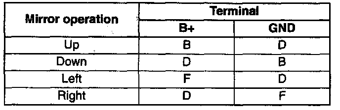 1. Apply battery positive voltage to the power outer mirror terminals and inspect the operation of the power outer mirror.