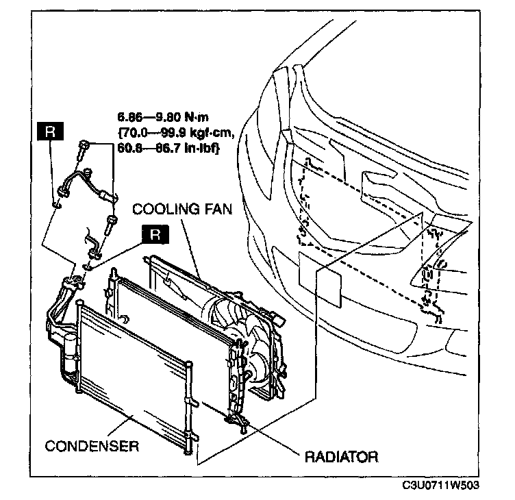 14. Release the radiator hook and pull the condenser up, being careful not to allow remaining compressor oil in the condenser to spill.