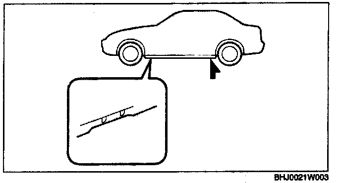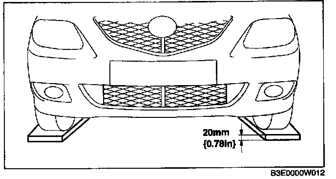 NOTE: Before setting the jack under the vehicle, place boards (approx. 20 mm {0.78 in} thick) under the front tires so that the bumper does not interfere with the jack.