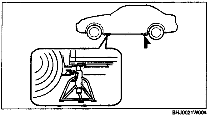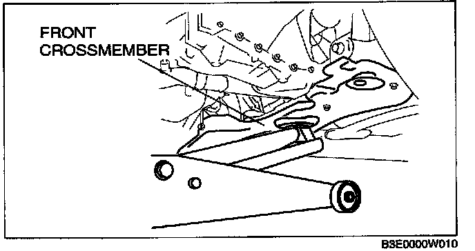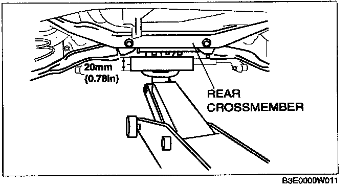 CAUTION: Place a board (approx. 20 mm {0.78 in} thick) between the rear cross member and the jack to prevent damage to the cross member.