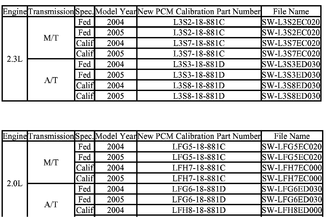 NOTE: The PCM Calibration Part Numbers listed above are provided for PCM reprogramming purposes only. These are not necessarily the same Mazda part numbers used to order an actual PCM through the Mazda Parts System. It is not necessary to order a PCM as part of this repair procedure.