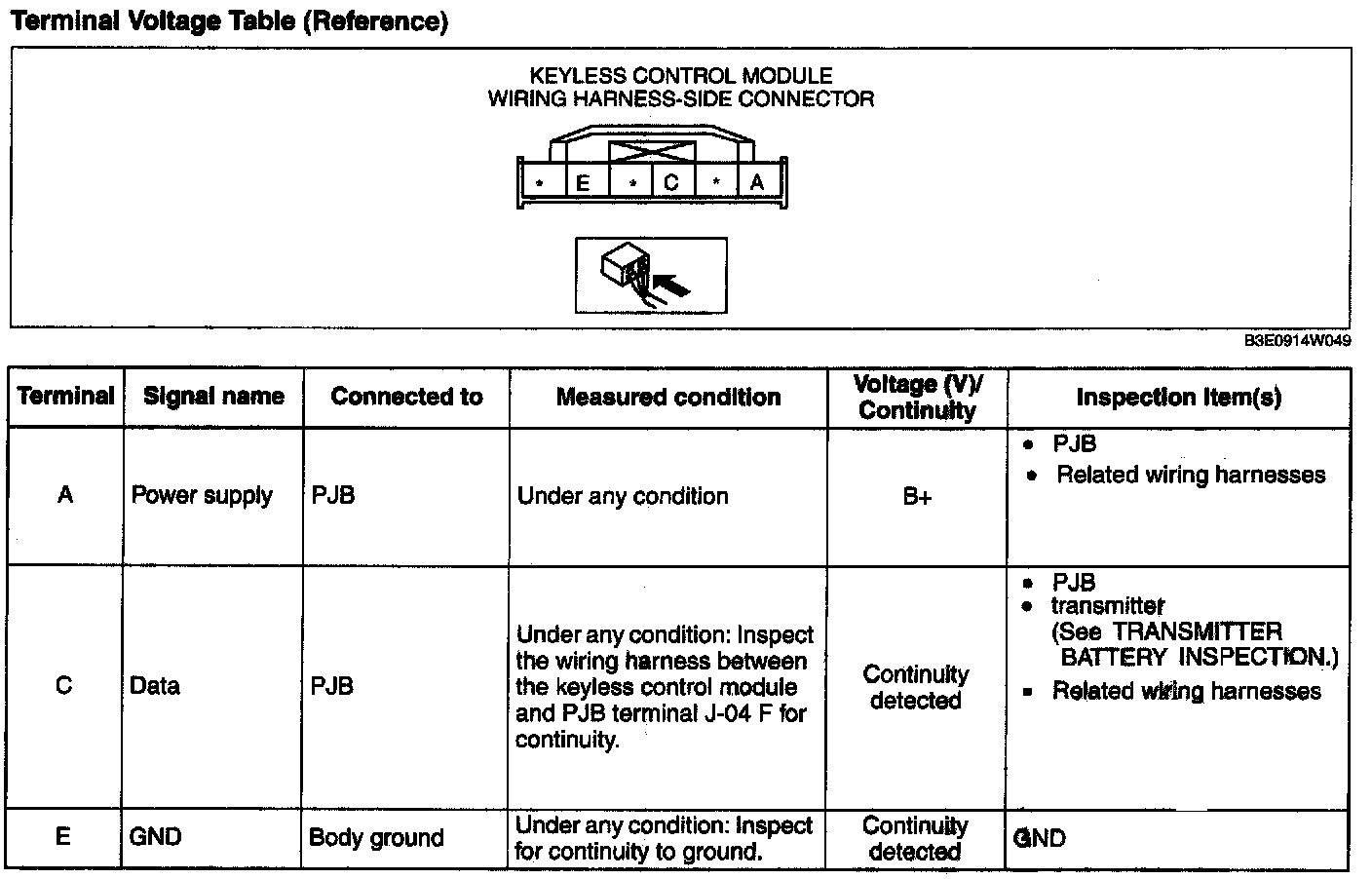1. Measure the voltage or inspect for continuity according to the Terminal Voltage Table (Reference).