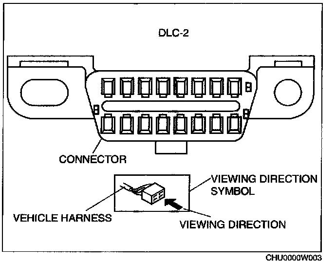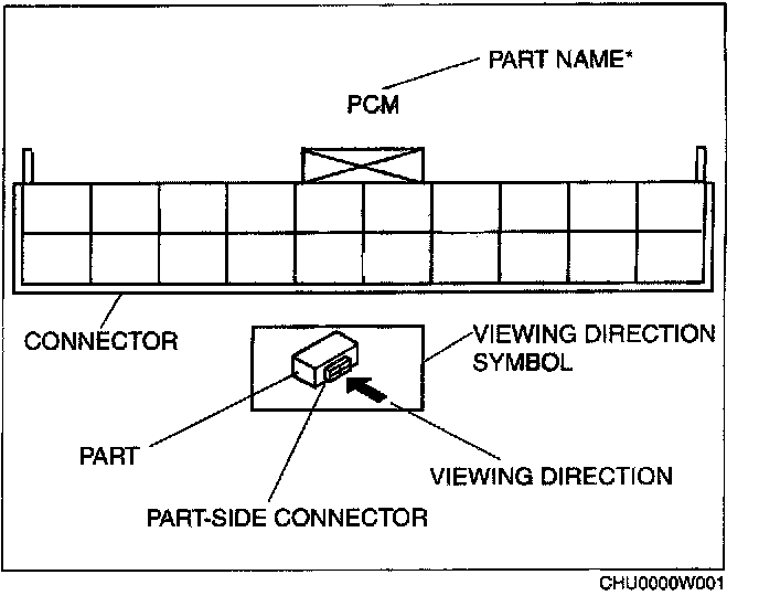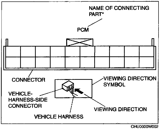 When it is necessary to show the terminal side of vehicle harness-side connectors, such as the following connectors, the viewing direction is from the terminal side.
