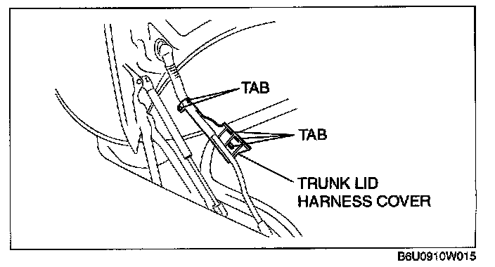 3. Disconnect the tabs, which secure the trunk lid harness to the trunk lid hinge.