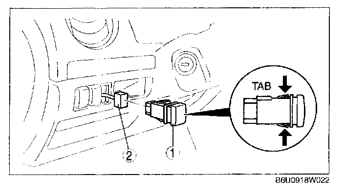 1. Insert your hand from the lower side of the dashboard and squeeze the tabs of the panel light control switch.