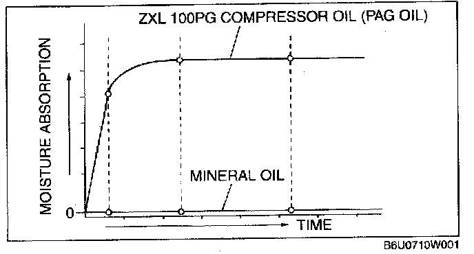 - ZXL 100PG compressor oil (PAG oil) has a higher moisture absorption efficiency than the previously used mineral oil. If moisture mixes with the compressor oil, the refrigerant system could be damaged. Therefore, install caps immediately after using the compressor oil or removing refrigerant system parts to prevent moisture absorption.