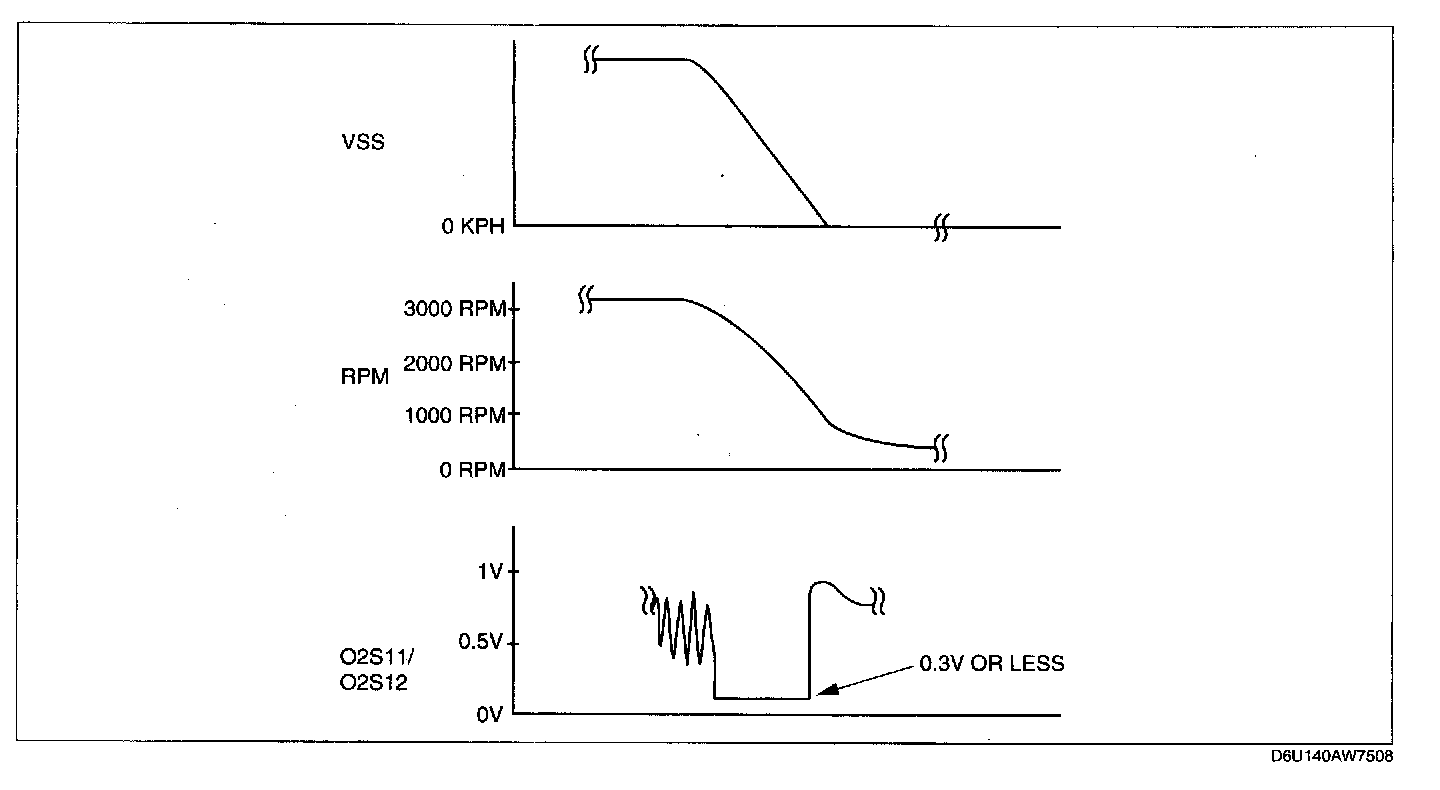 4. Verify that the front/rear HO2S outputs a voltage of 0.6 V or more, one time or more, then verify that the front/rear HO2S voltage (PID: O2S11/O2S12) is 0.3 V or less while decelerating as shown in the figure.