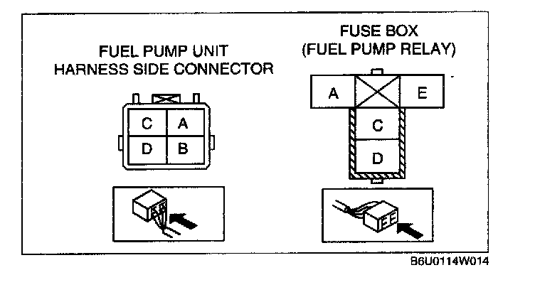 - Fuel pump unit terminal B and fuel pump relay terminal C