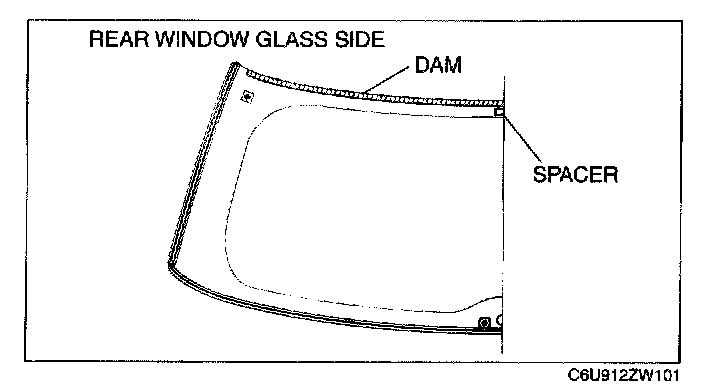 NOTE: Before removing the rear window glass from the body, mark the position of the glass by affixing tape to the glass and body panel.
