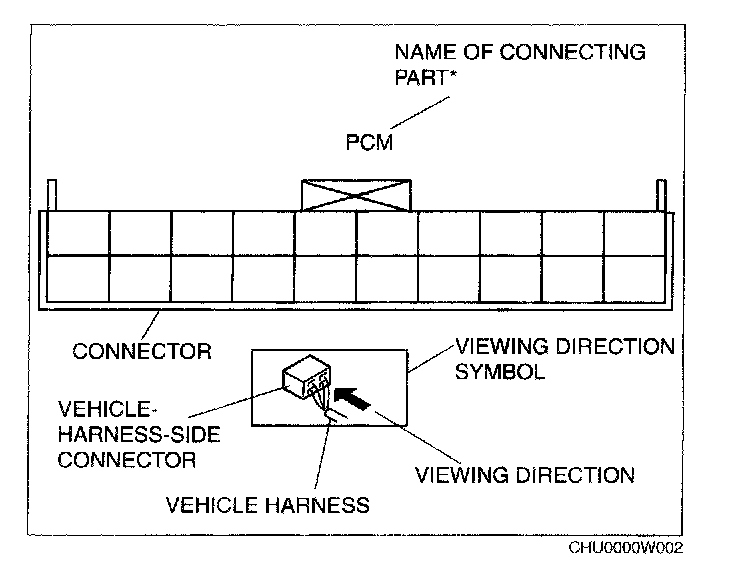 When it is necessary to show the terminal side of vehicle harness-side connectors, such as the following connectors, the viewing direction is from the terminal side.