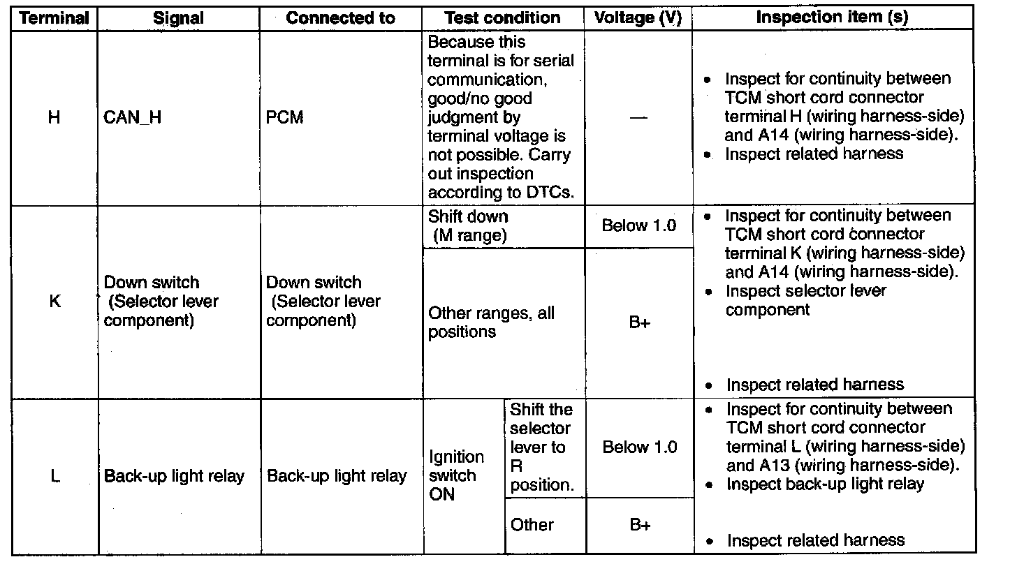 2. Measure the voltage at each TCM short cord connector wiring harness-side) terminal and refer to the terminal voltage table.