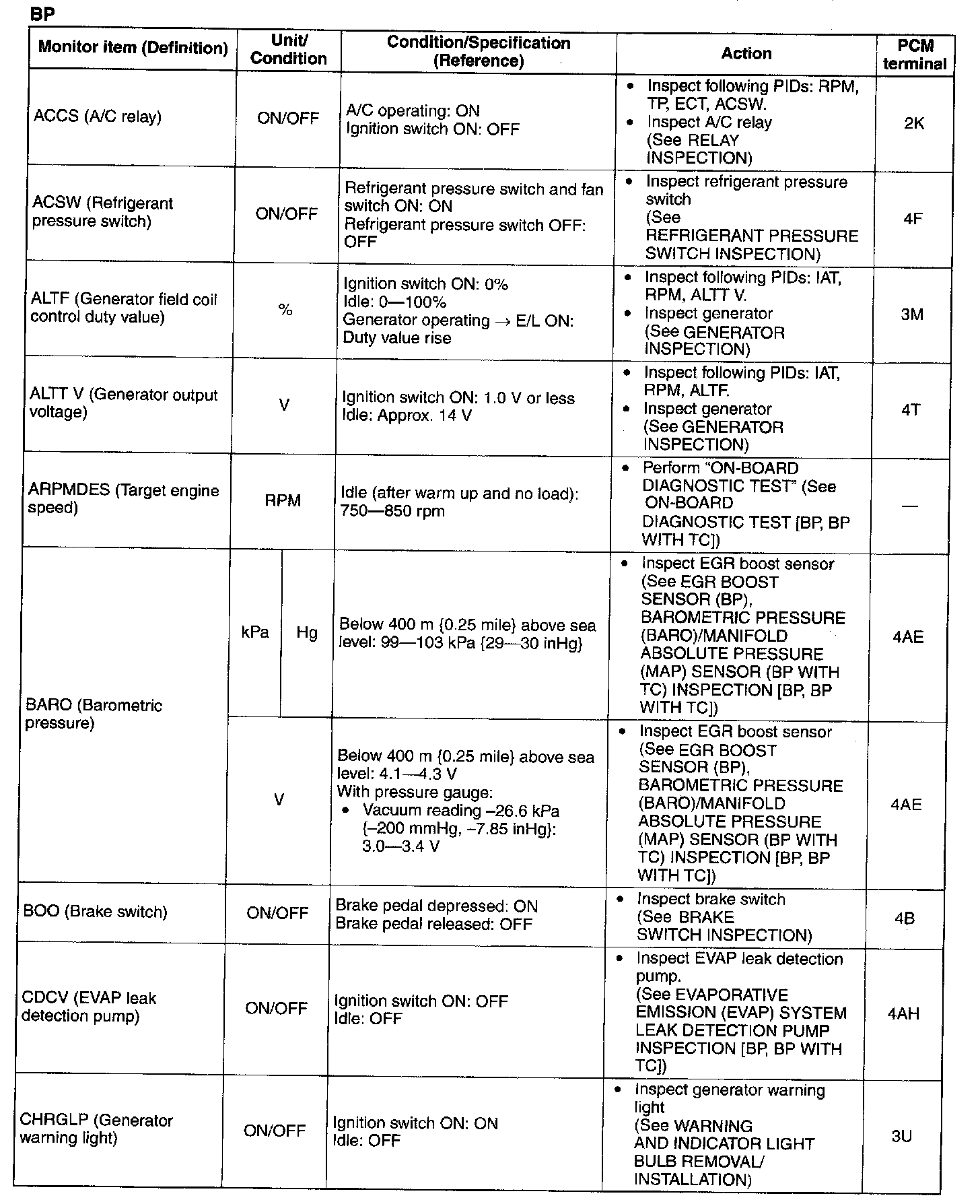 - Camshaft position sensor. (See CAMSHAFT POSITION (CMP) SENSOR INSPECTION [BP, BP WITH TC].)