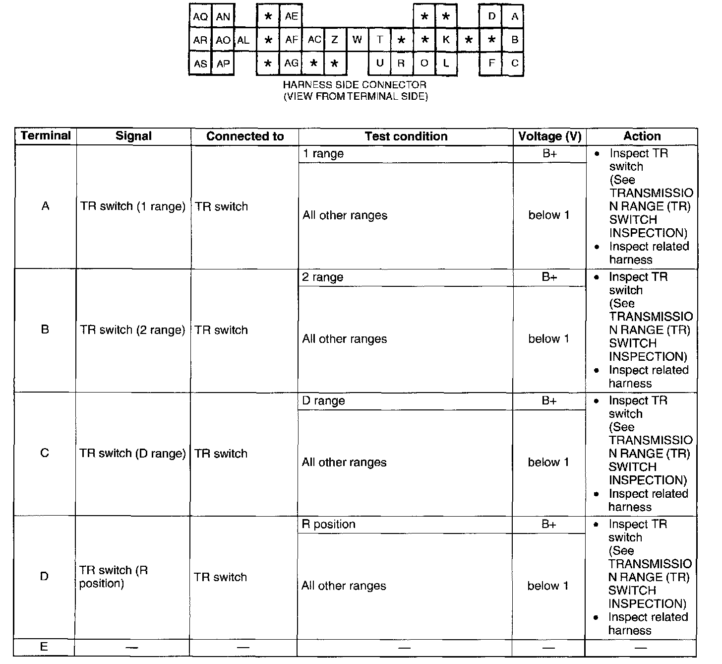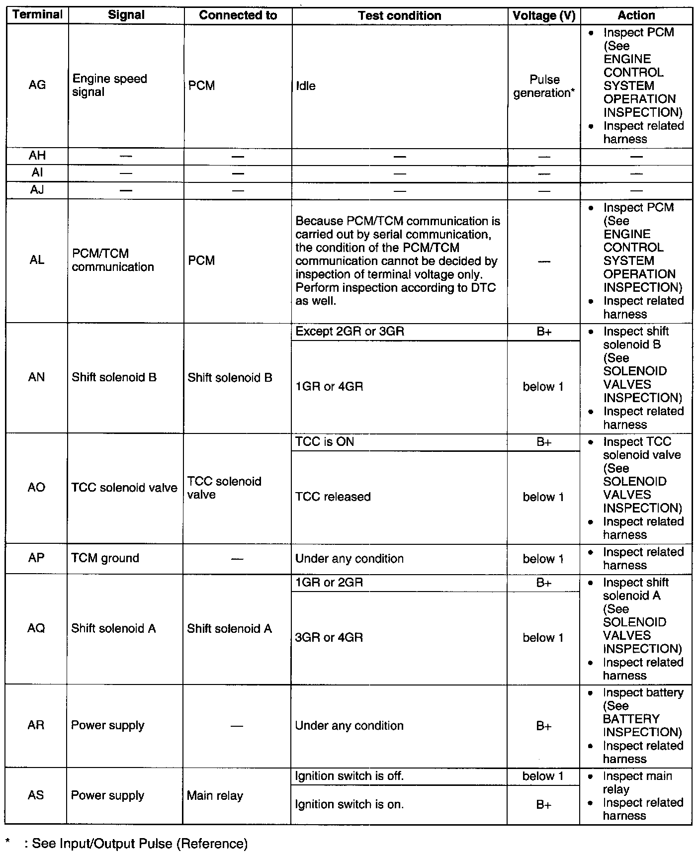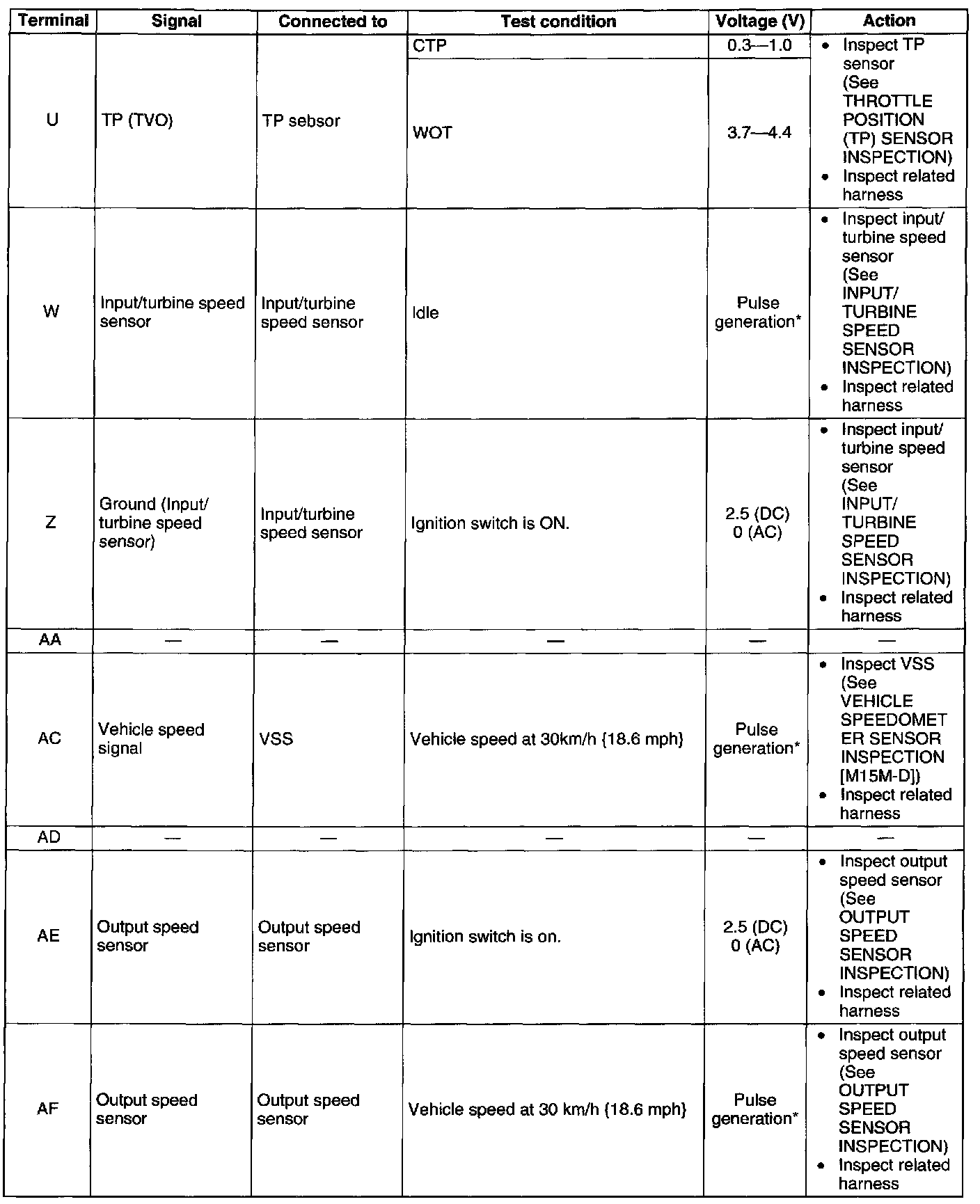 Note: Use the ground of terminal AP of the TCM when measuring terminal voltage as an error may occur when the negative (-) lead of the circuit tester is connected to ground.