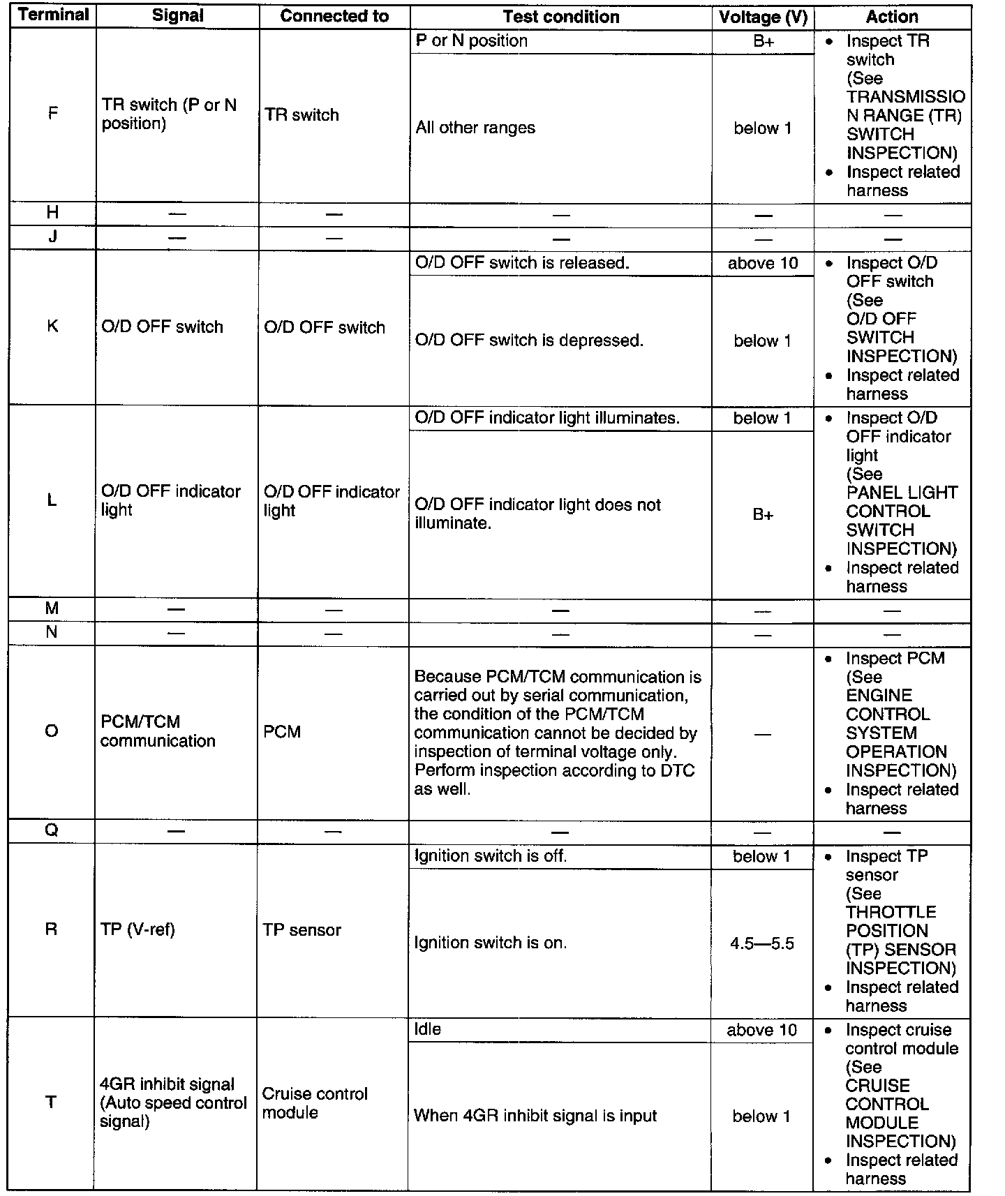 - If any TCM terminal voltage is incorrect, inspect the related input of output devices and wiring.
