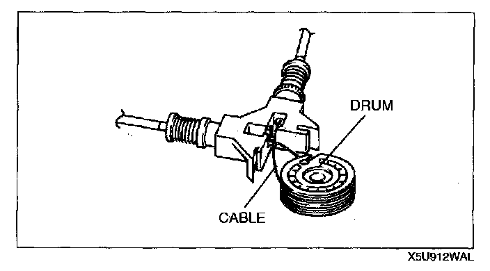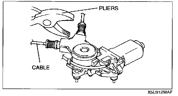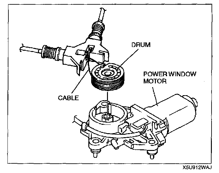 5. Assemble into the power window motor. Taking care to prevent the cable from getting caught between the drum and the motor and the motor housing, carefully assemble the cable onto the upper bracket pulley.