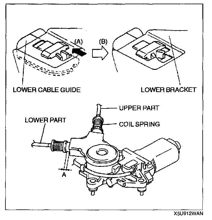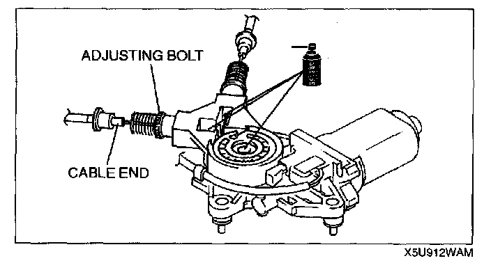 9. For the upper part, pull the (A) part of the cable and for the lower part, pull the (B) part of the cable. Adjust the adjusting bolts, making sure the coil springs do not bend.