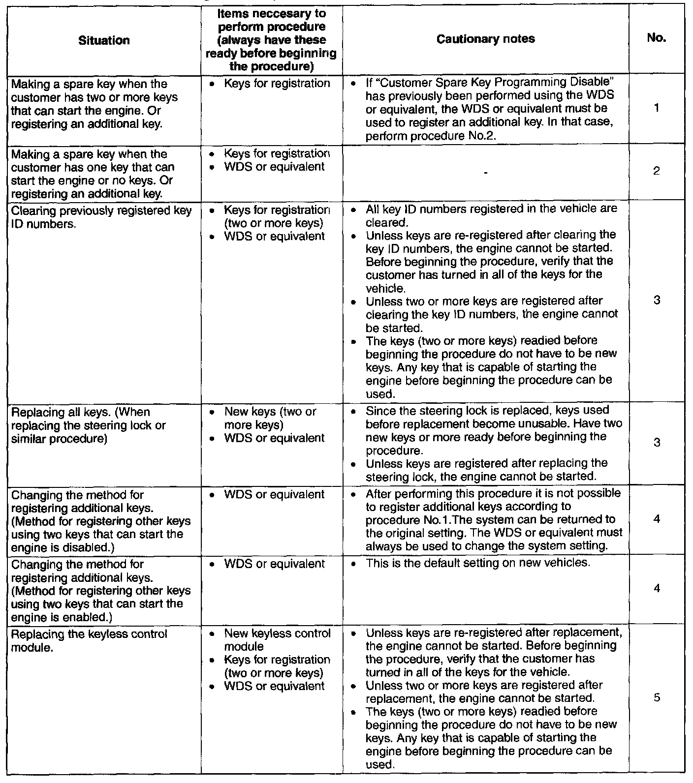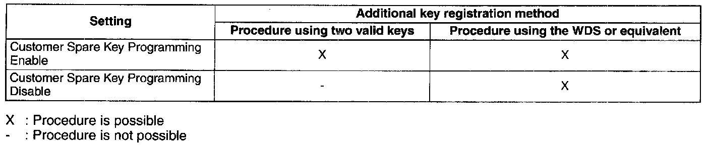 - By disabling the "No.1 Additional Key Registration Procedure (Using Two Valid Keys)", only the WDS or equivalent can be used to register additional keys, thereby preventing two valid keys from being used to create an unauthorized spare key. This function is for use by rental car or other companies with vehicle fleets.
