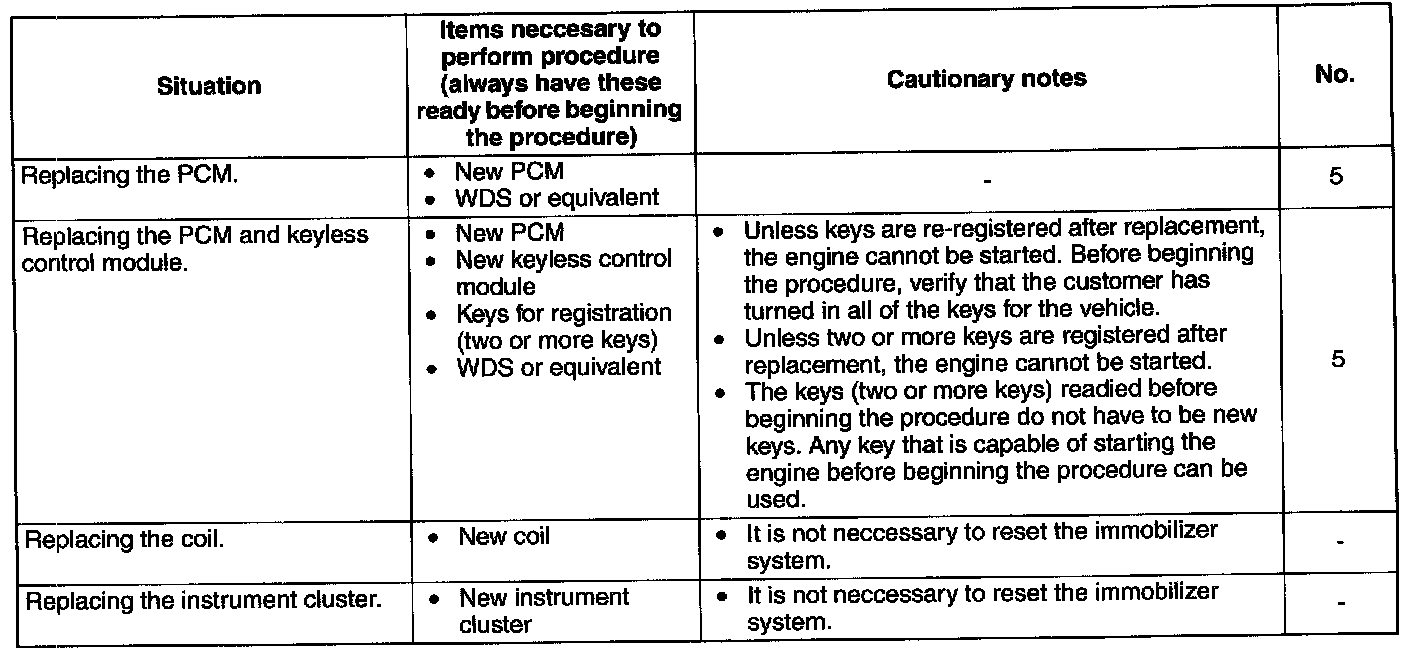 No.5 Resetting Procedure for the Immobilizer System when Replacing the PCM or Keyless Control Module Conditions