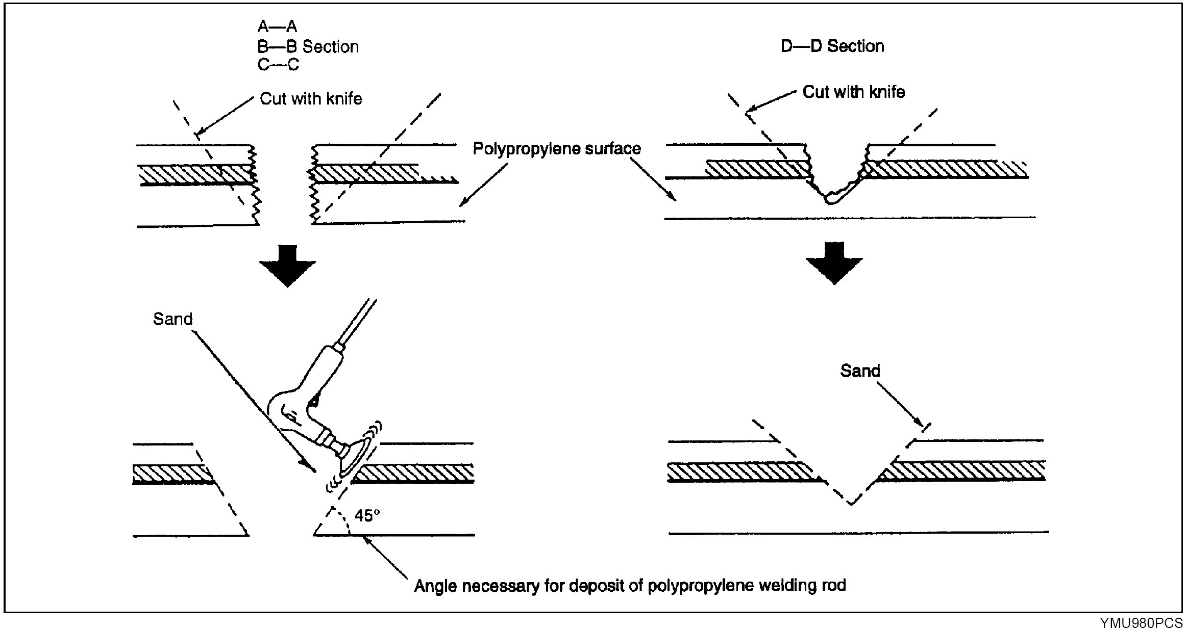 Repair of polypropylene bumpers having damage that has reached the surface of the polypropylene and are too serious to be restored by painting only.