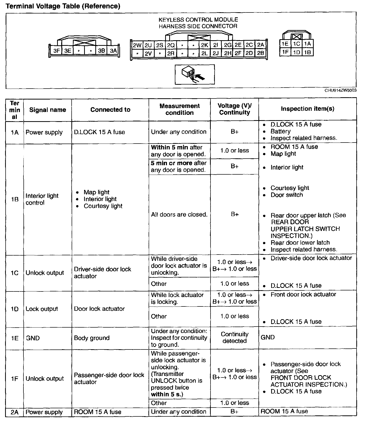 KEYLESS CONTROL MODULE INSPECTION1. Measure the voltage or inspect for continuity according to the Terminal Voltage Table (Reference).