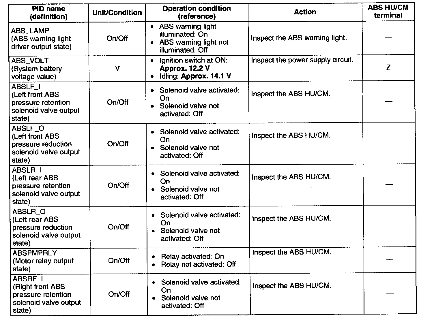 PID/DATA Monitor Table