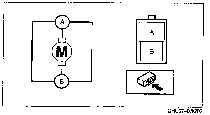 BLOWER MOTOR INSPECTION1. Connect battery positive voltage to blower motor terminal A, ground to terminal B, and then verify that the blower motor operates smoothly.