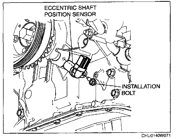 ECCENTRIC SHAFT POSITION SENSOR REMOVAL/INSTALLATIONCAUTION: When replacing the eccentric shaft position sensor, make sure there is no foreign material on it such as metal shavings. If it is installed with foreign material, the sensor output signal will malfunction resulting from fluctuation in magnetic flux and cause a deterioration in engine control.