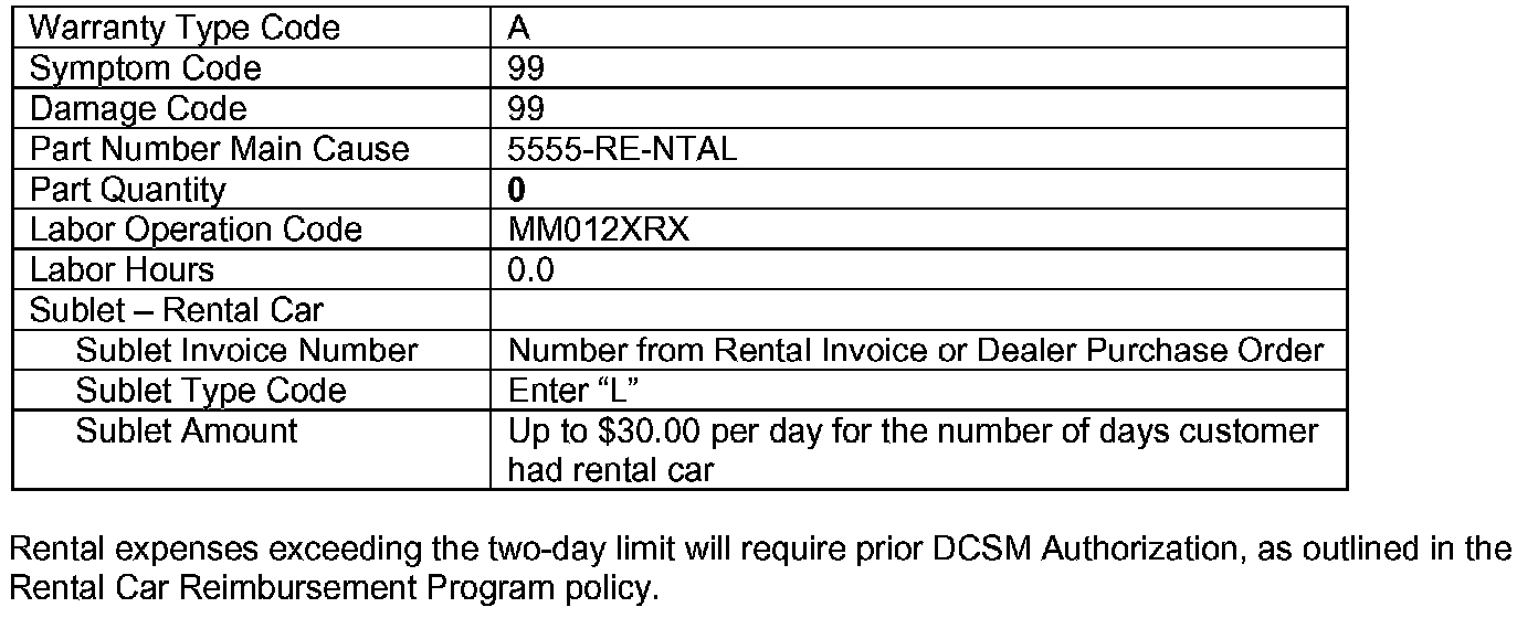 A rental car may be provided to the customer if eligible based on the terms and conditions of the Rental Car Reimbursement Program, policy 12.0. Rental car reimbursements are available only on 2001 and newer vehicles within the mileage and time limitations under the New Vehicle Limited Warranty. If the customer was placed in a rental car while the campaign was being completed, submit a separate claim/problem using the standard rental claim information.