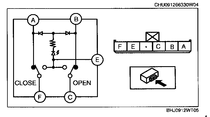 2. Connect battery positive voltage to terminal E and ground to the terminal A. Verify that continuity exists.