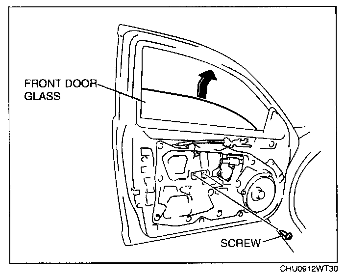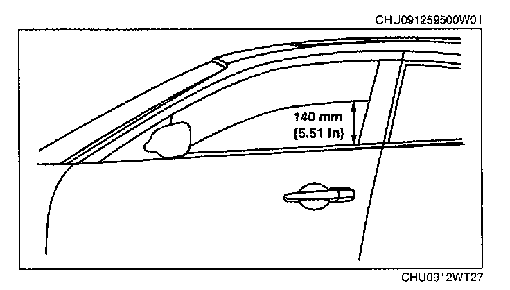 FRONT DOOR GLASS REMOVAL/INSTALLATION1. Position the front door glass so that the distance between the top of the front door glass and top of. the front beltline molding is 140 mm {5.51 in}.