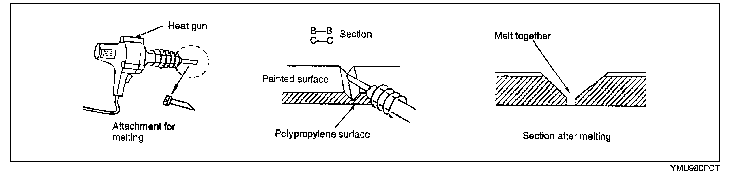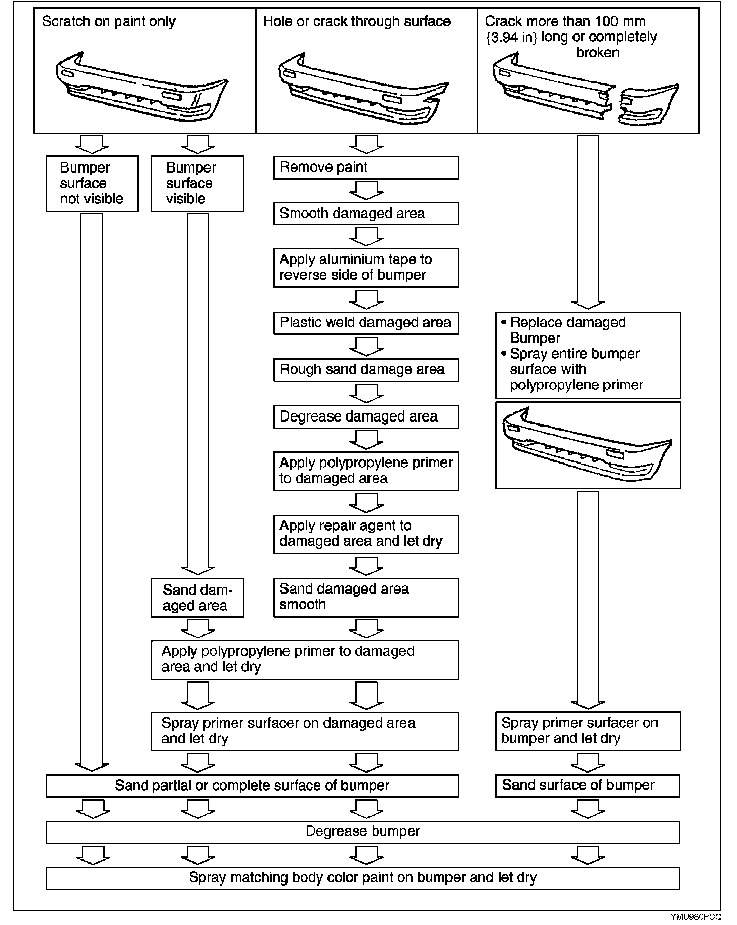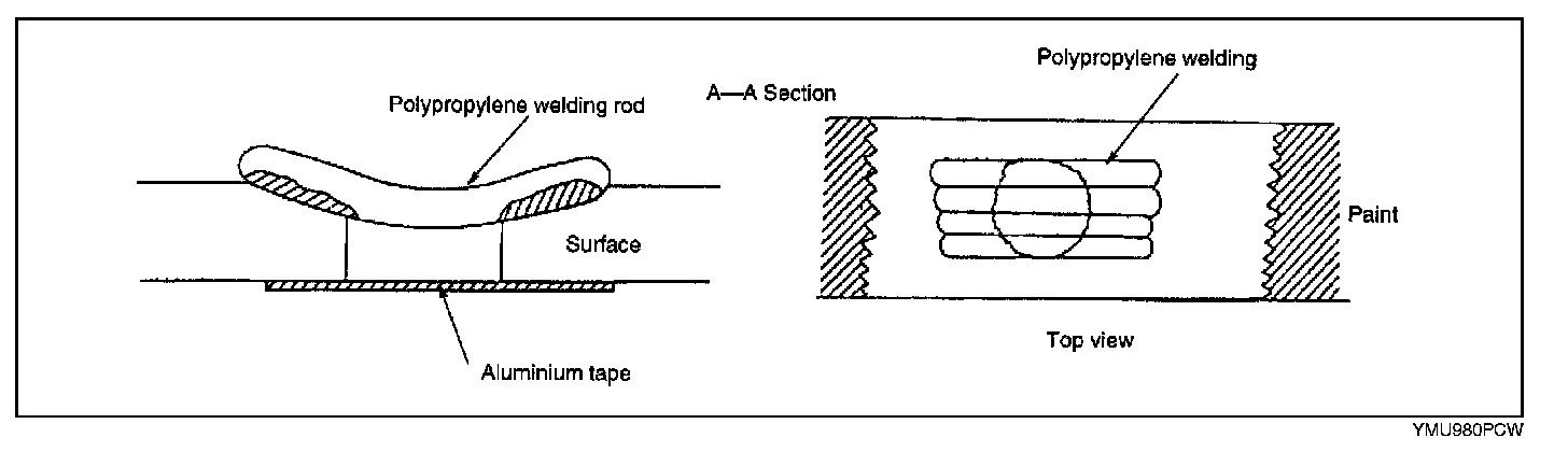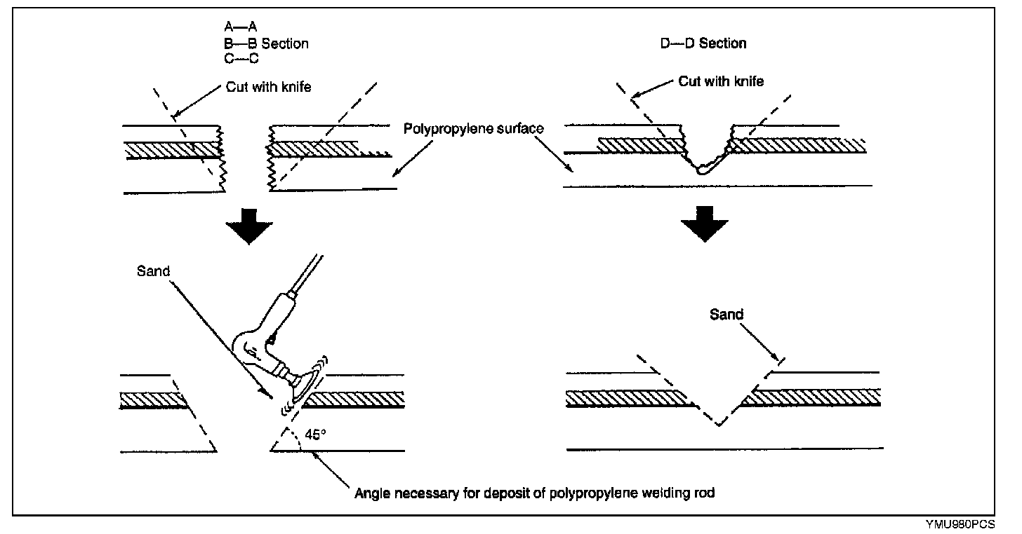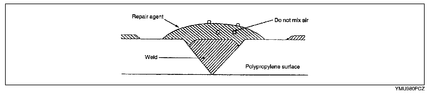 The repair agent is a two part epoxy adhesive. When the repair agent hardens, it will provide a good finish with the same flexibility as the polypropylenes. The repair agent for a urethane bumper is also a two part adhesive compound. However, this is different from that for a polypropylene bumper. If the incorrect repair agent is used, the repair will be faulty.
