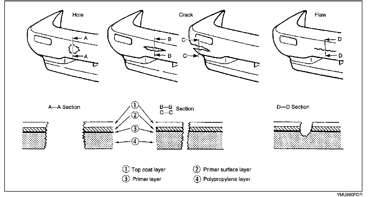 The three types of damaged bumpers shown below are considered repairable. Although a bumper which has been damaged greater than this could also be repaired, it should be replaced with a new one because such repair would detract from the looks and quality of the bumper. In addition, such repair is not considered reasonable in terms of work time.