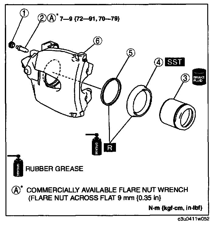 Warning: When blowing compressed air into the caliper body, the piston may pop out and cause injury if not supported at the correct point. Securely support the piston friction surface by hand when blowing compressed air.