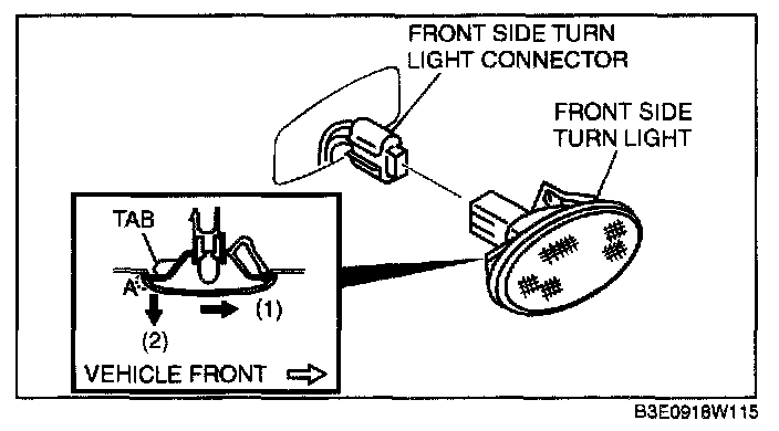 3. Pull area A of the front side turn light in the direction of the arrow (2) and remove the front side turn light.