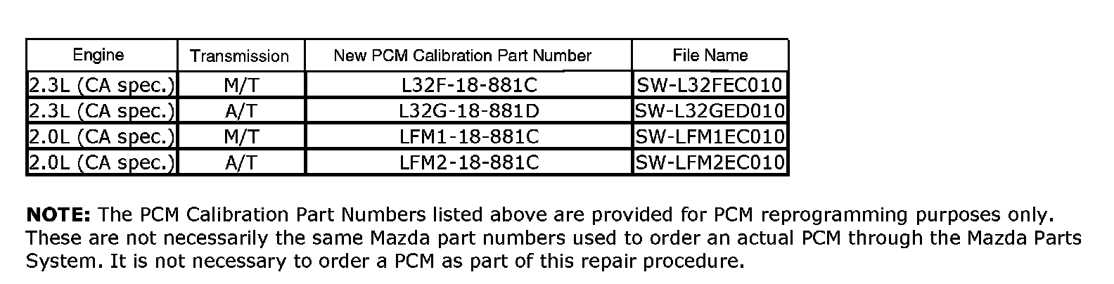^ Please be aware that PCM calibration part numbers and file names listed in any Service Bulletin may change due to future releases of PDS/IDS software, and additional revisions made to those calibrations for service related concerns.