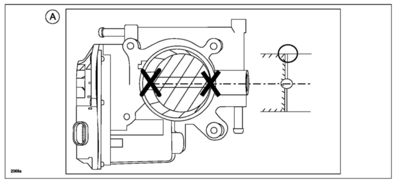 DO NOT spray the cleaner directly inside the throttle body and DO NOT wipe around the throttle valve shaft shown with an X.