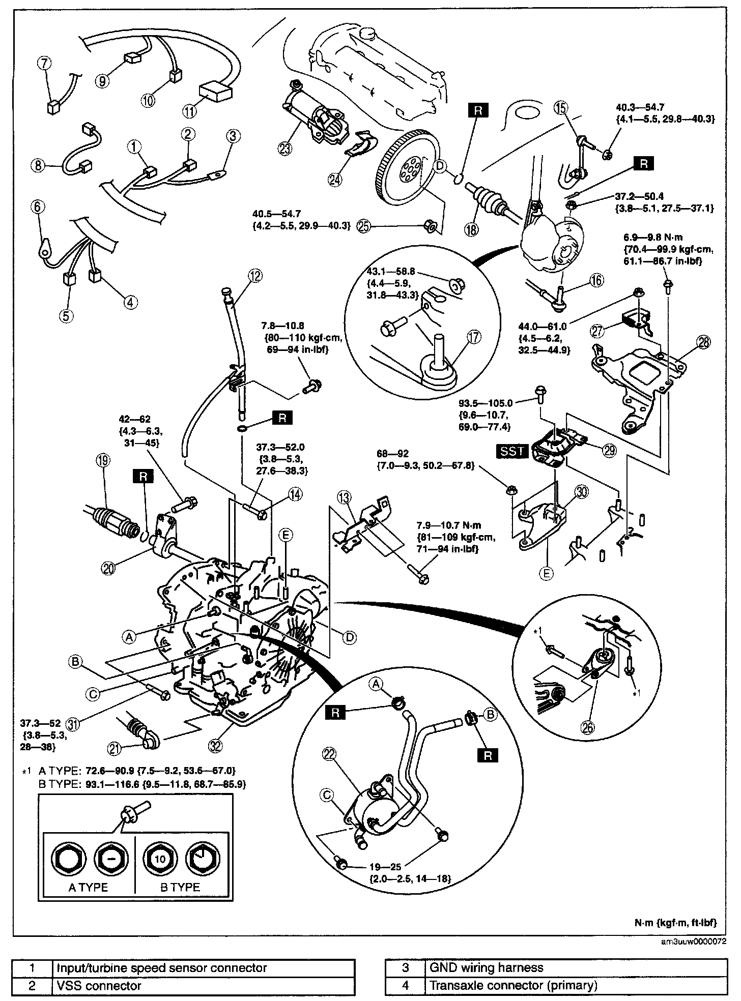 A type: 72.6 - 90.9 N-m (7.5 - 9.2 kgf-m, 53.6 - 67.0 ft-lbf)