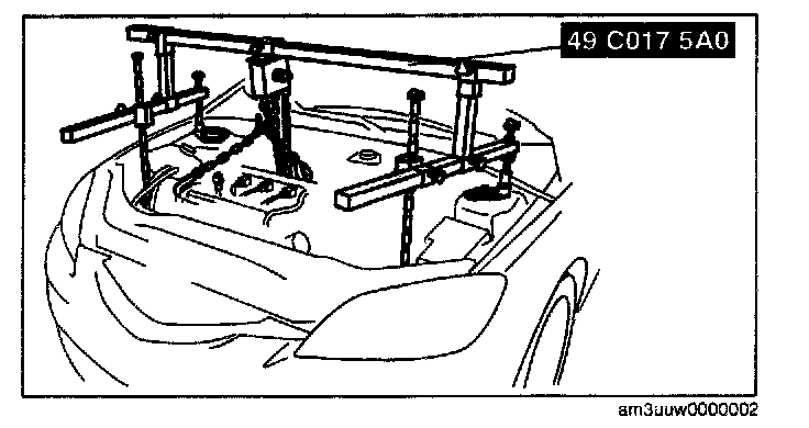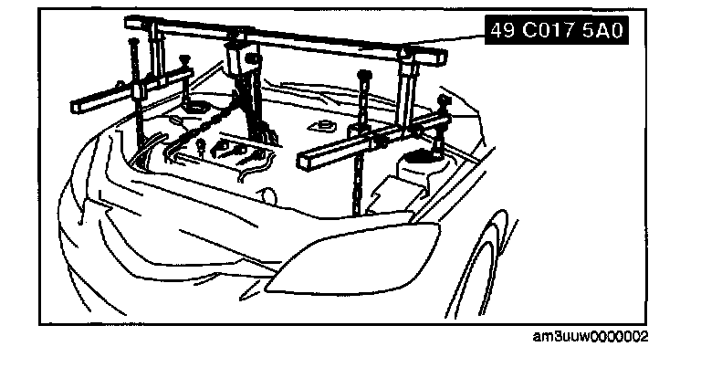 (2) Install the left rear shaft of the SST to the bolt of the left shock absorber (identical position to right side).