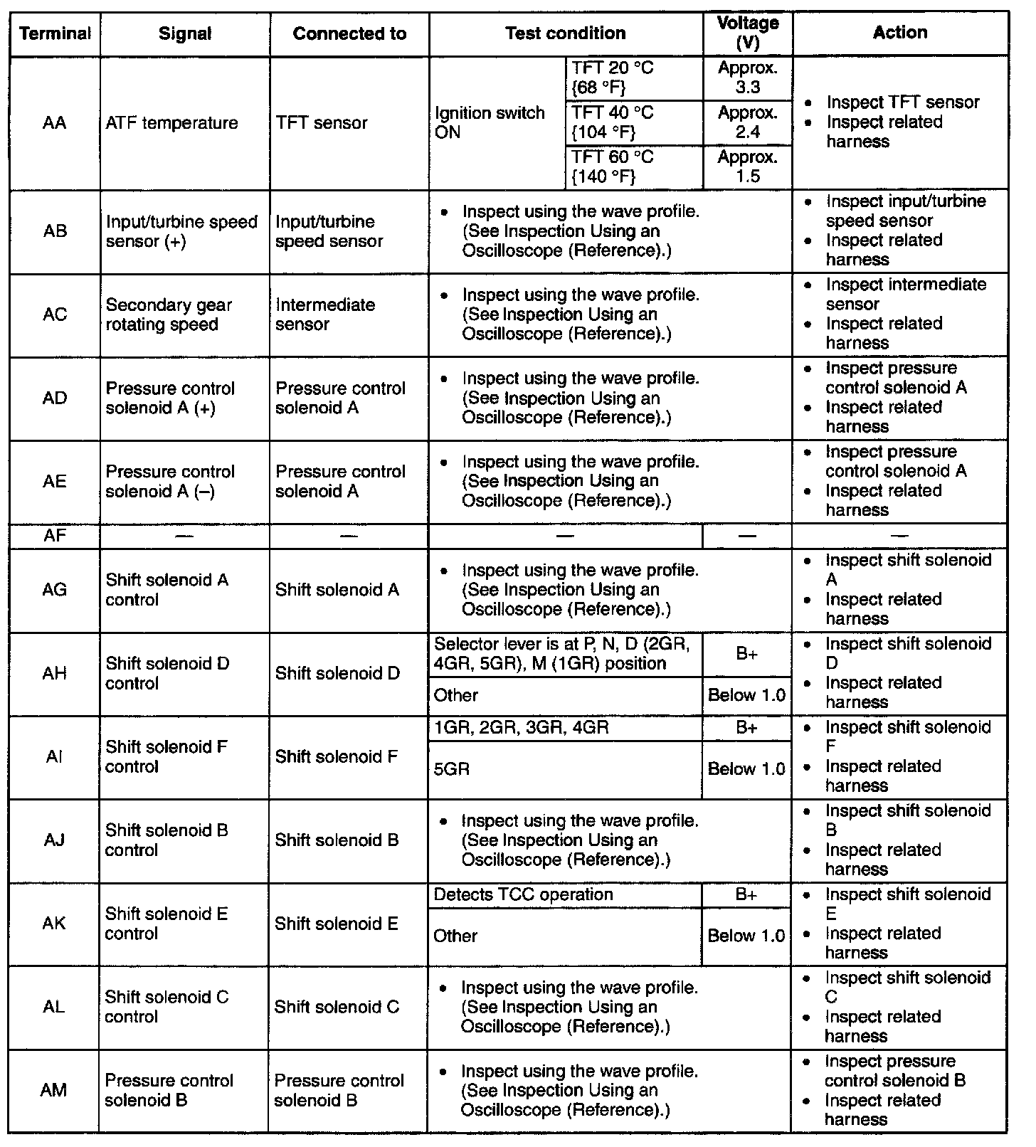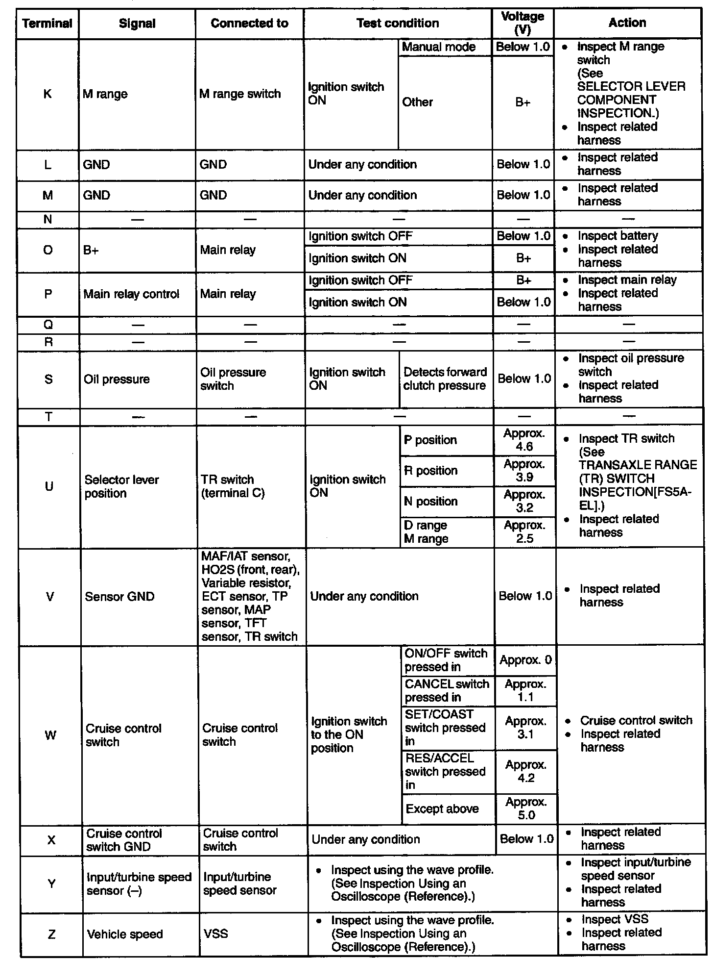 TCM INSPECTION [FS5A-EL]Caution: The TCM terminal voltages vary with changes in measuring and vehicle conditions. Always carry out a total inspection of the input and output systems, and the TCM to determine the cause of trouble. Otherwise, a mis-diagnosis could occur.