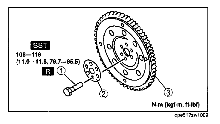 Tightening torque 108 - 116 N-m (11.0 - 11.8 kgf-m, 79.7 - 85.5 ft-lbf)