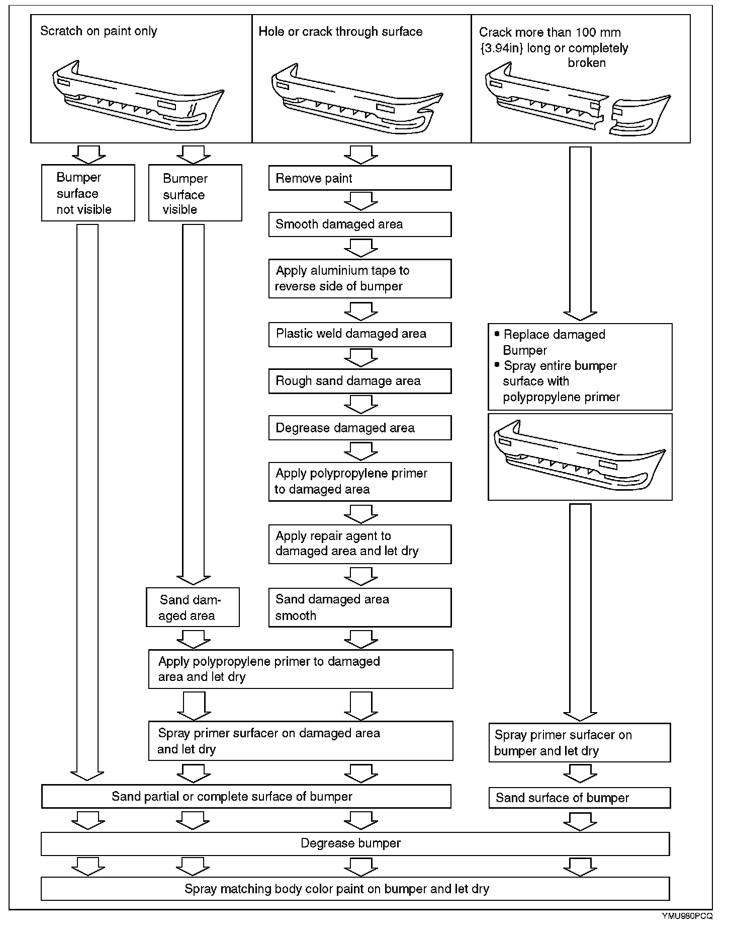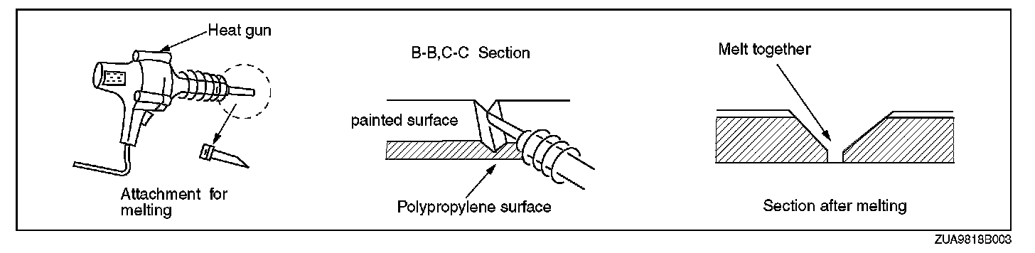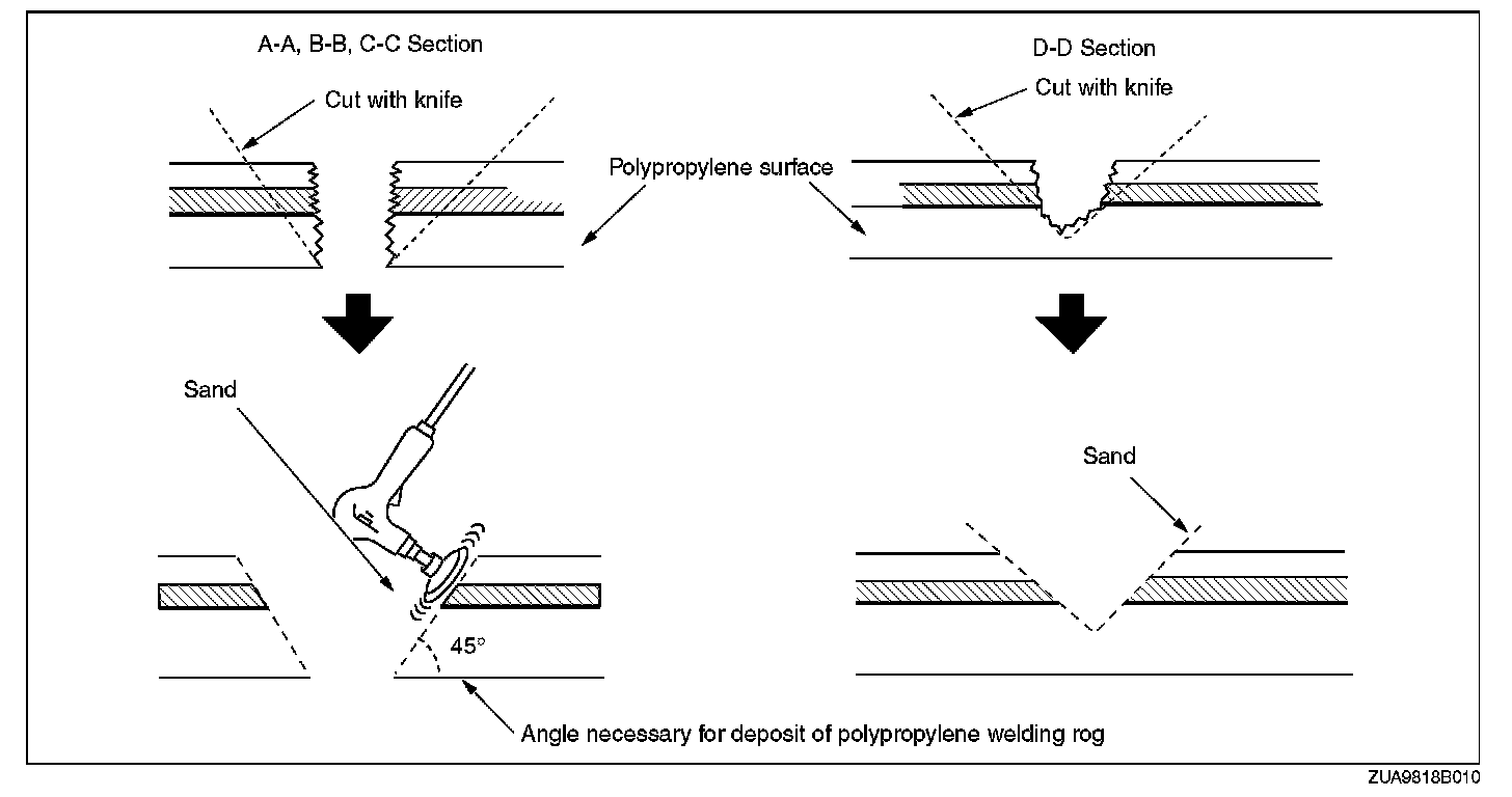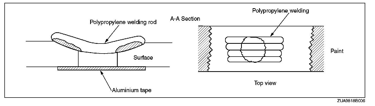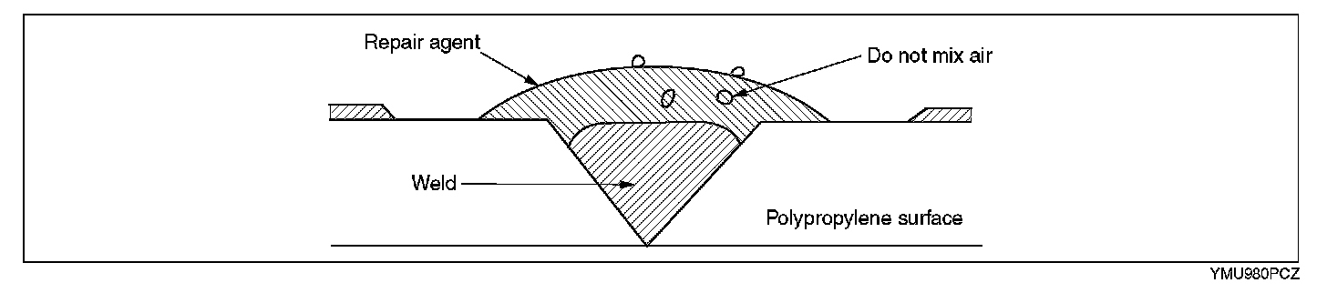 The repair agent is a two part epoxy adhesive. When the repair agent hardens, it will provide a good finish with the same flexibility as the polypropylenes. The repair agent for a urethane bumper is also a two part adhesive compound. However, this is different from that for a polypropylene bumper. If the incorrect repair agent is used, the repair will be faulty.