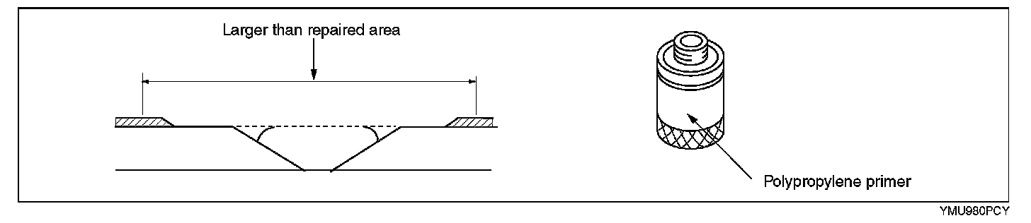 5. Uniformly apply polypropylene primer with a brush to an area larger than the repaired area. Allow to dry about 10 minutes at 20 degrees C {68 degrees F}.