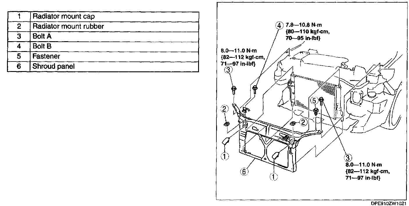 SHROUD PANEL REMOVAL/INSTALLATIONCAUTION: Because the shroud panel is installed to the front bumper reinforcement, support the shroud panel using a jack before removing the front bumper reinforcement so as not to apply excessive force to the shroud panel.