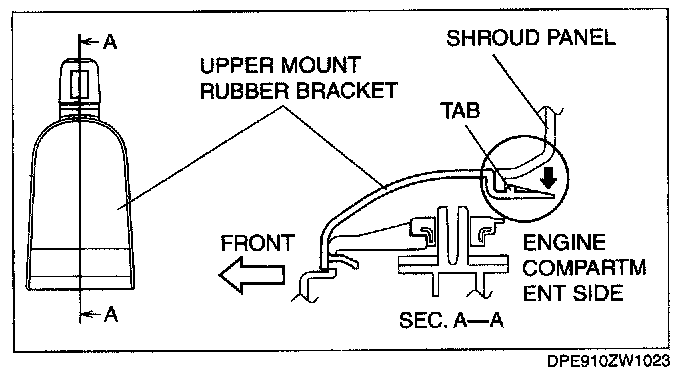 1. Remove the upper mount rubber bracket while pressing down the upper mount rubber bracket tab in the direction of the arrow.