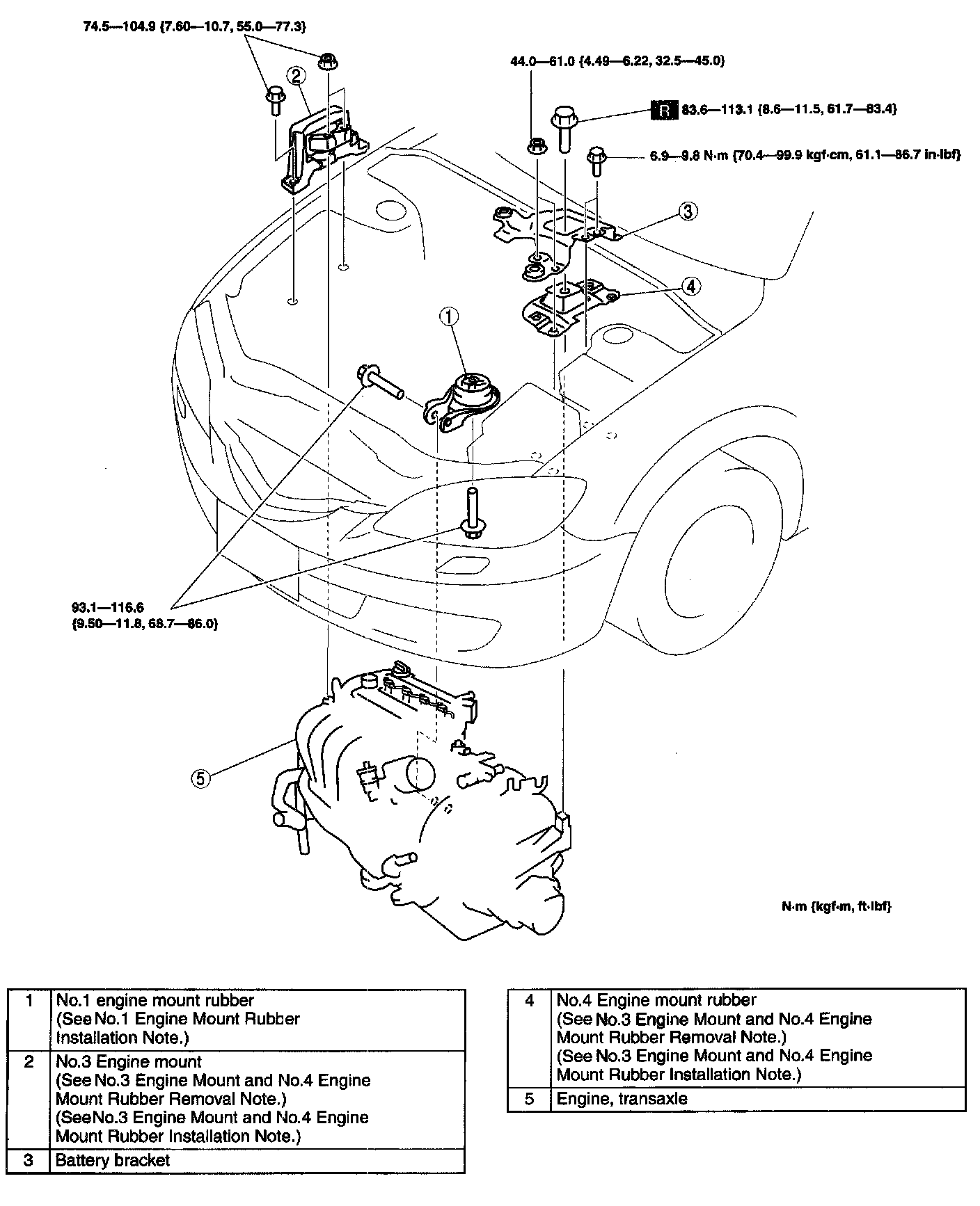 Note: Do not tighten the bolt and nut for the No.1 engine mount rubber and No 4 engine mount rubber during this step.