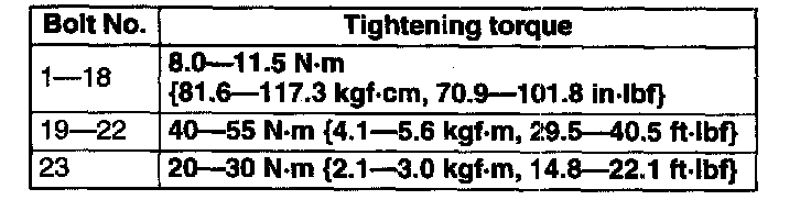 Tightening torque 18 - 22 Nm (1.9 - 2.2 kgf-m, 13.3 - 16.2 ft. lbs.)