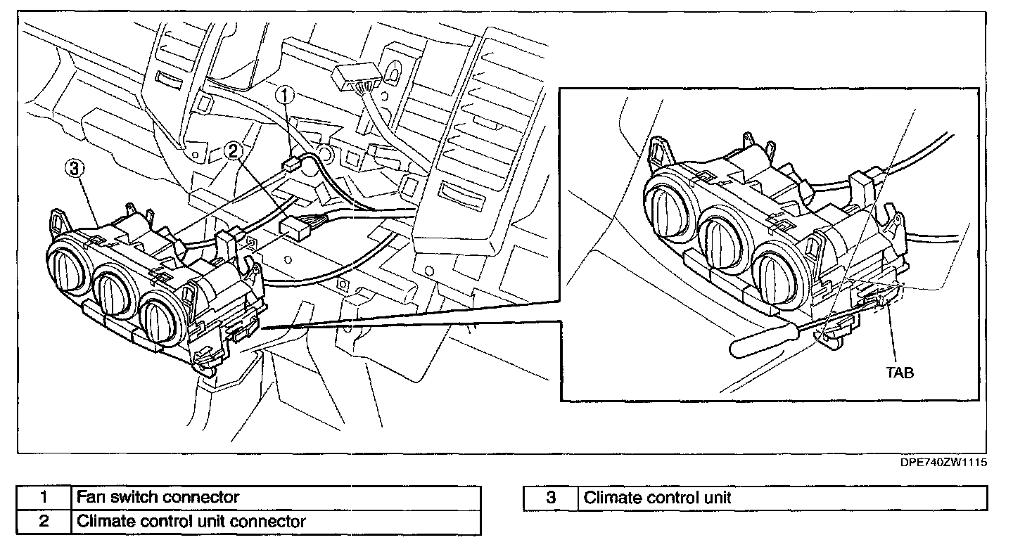 4. Connect the climate control unit connector, fan switch connector.