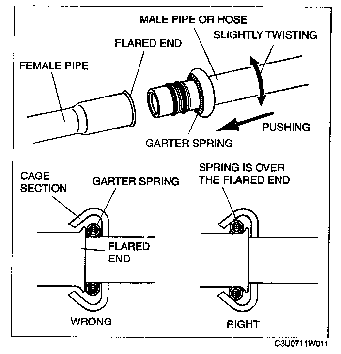 1. Connect the male pipe or hose by pushing it while slightly twisting it onto female pipe until the garter spring at the male pipe or hose is over the flared end of female pipe.