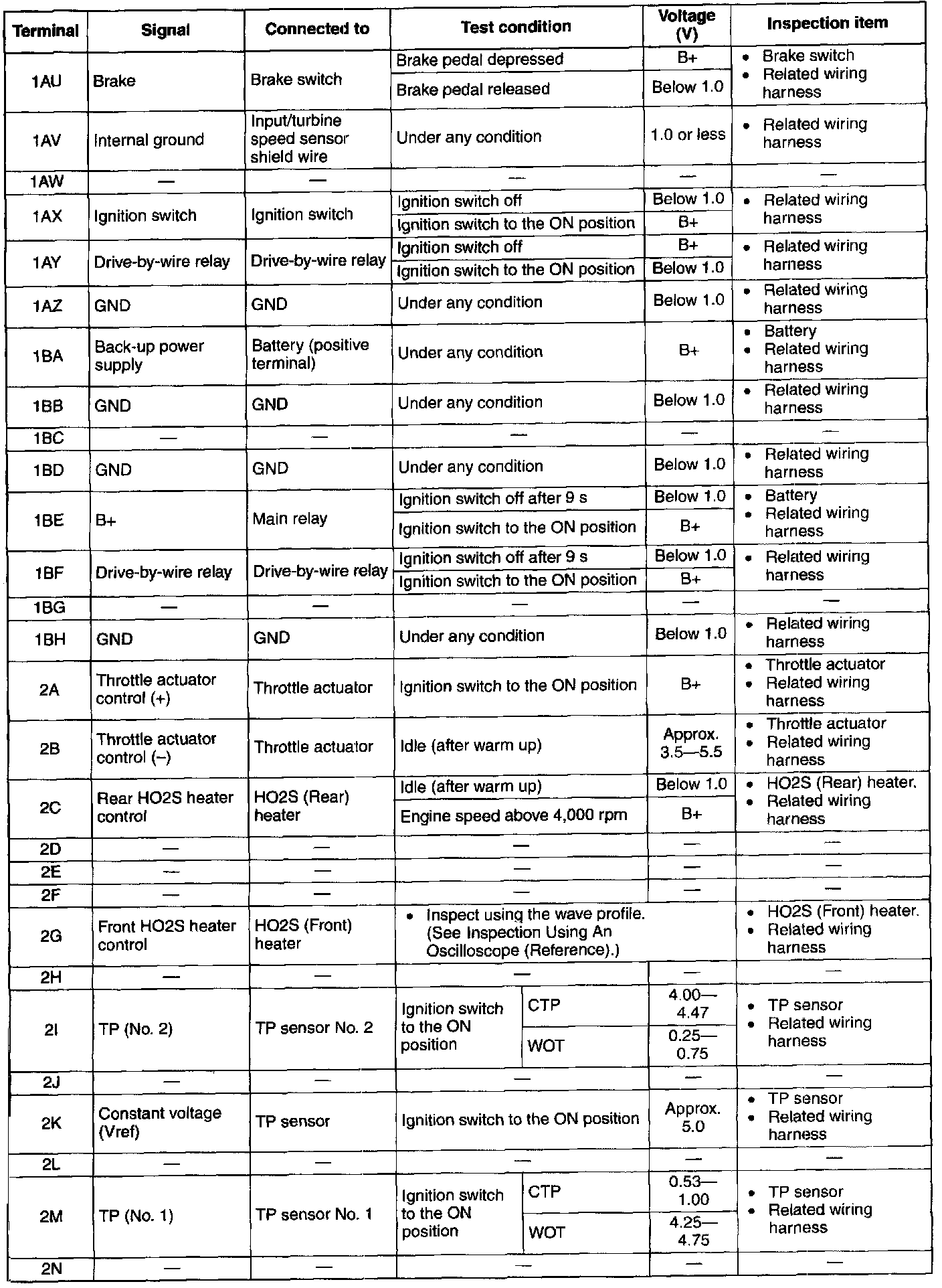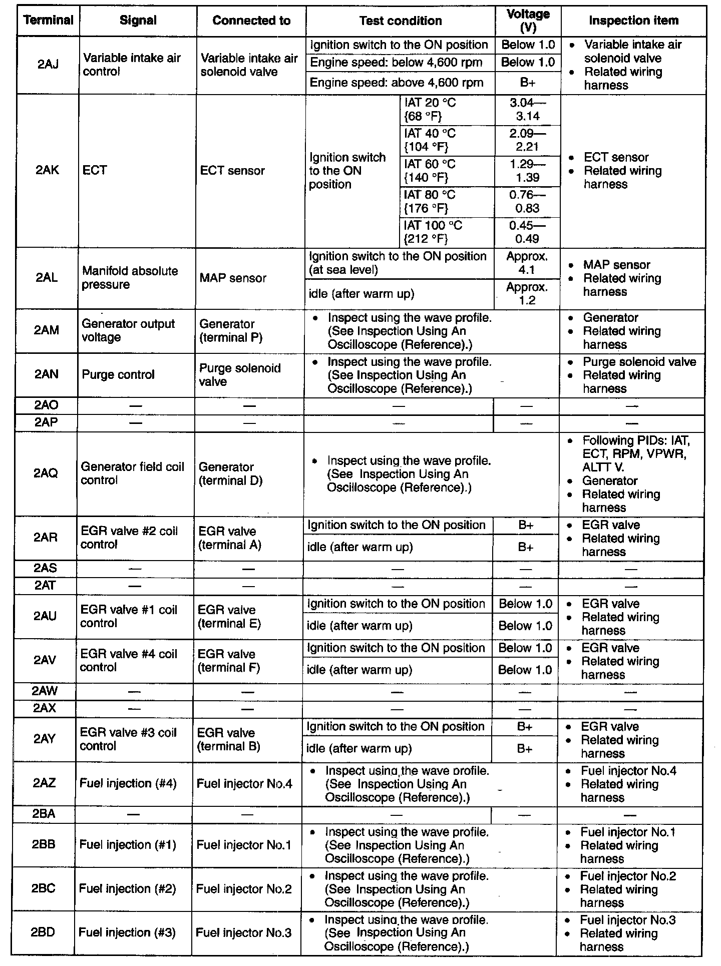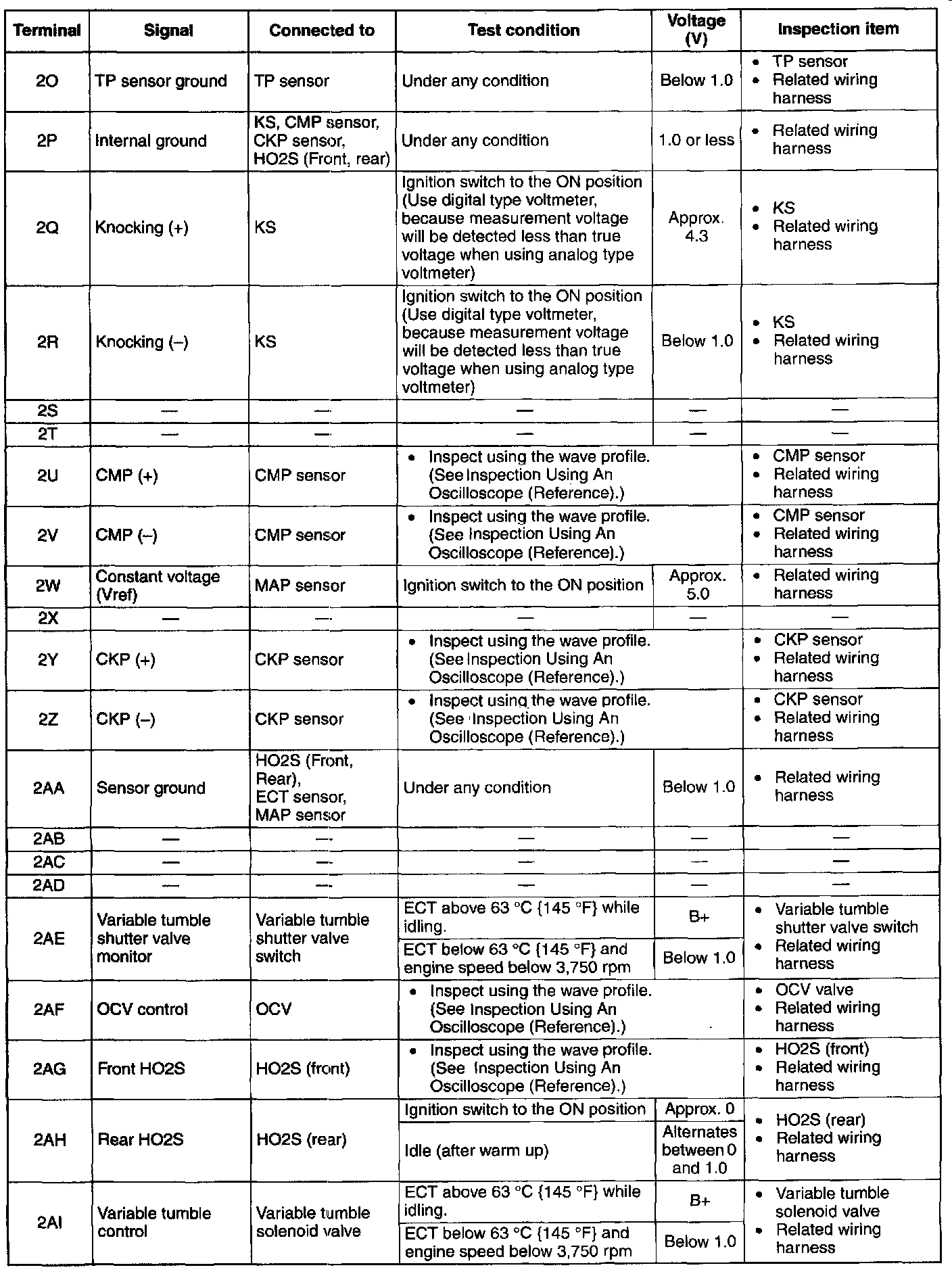 NOTE: The PCM terminal voltage can vary with the conditions when measuring and changes due to aged deterioration on the vehicle, causing false diagnosis. Therefore determine comprehensively where the malfunction occurs among the input systems, output systems, and the PCM.